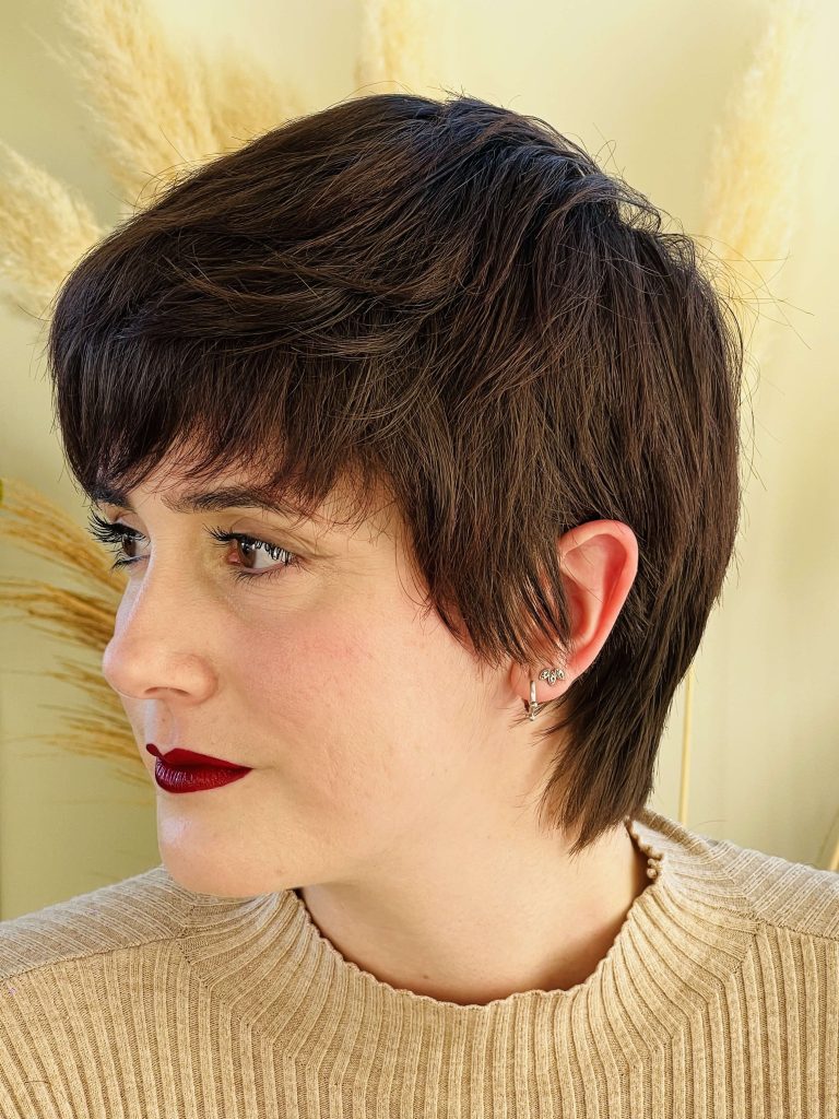 - Pixie con flequillo: Agregar un flequillo a tu corte pixie puede cambiar totalmente la apariencia. Puede ser un flequillo corto, largo, recto o despeinado, dependiendo de tu preferencia y forma del rostro.